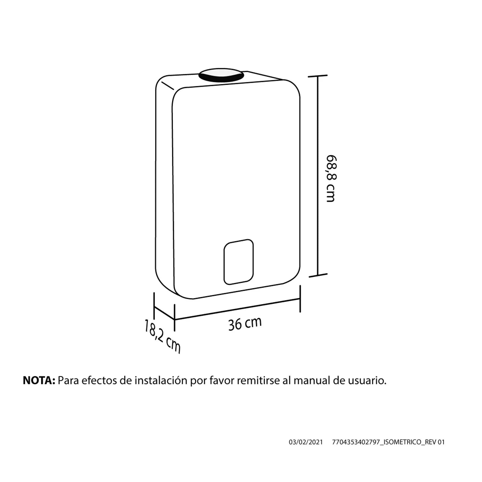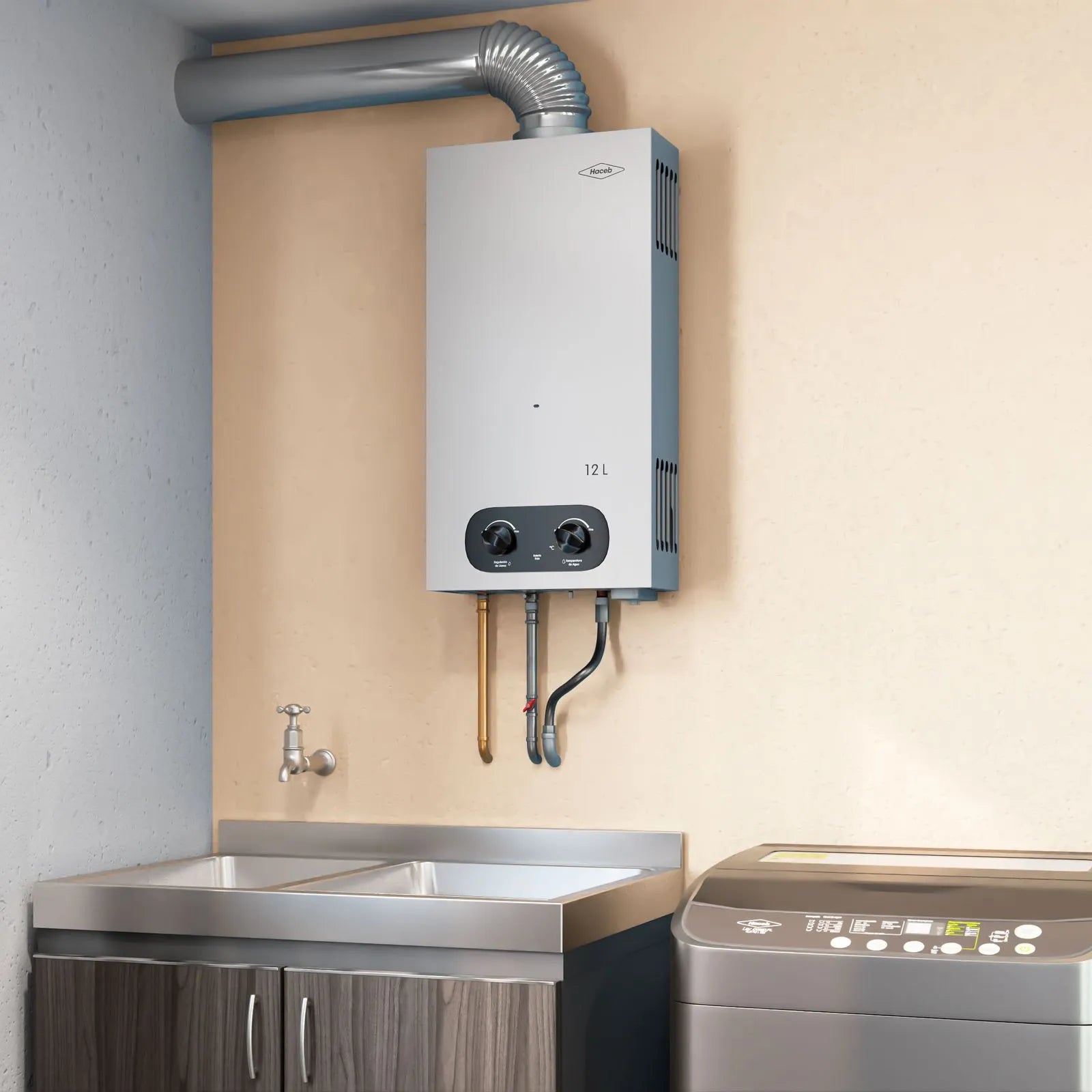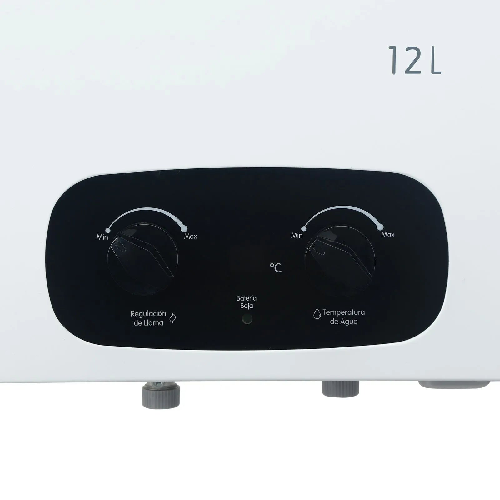 Calentador de agua a gas natural de 12 litros por minuto con tiro natural. Ofrece temperatura regulable, display indicador y perillas de fácil manejo para controlar la temperatura y el consumo de gas. Incorpora visor de llama, temporizador de apagado automático tras 20 minutos de uso continuo y sistema de seguridad. Funciona con baterías y requiere ducto de evacuación.