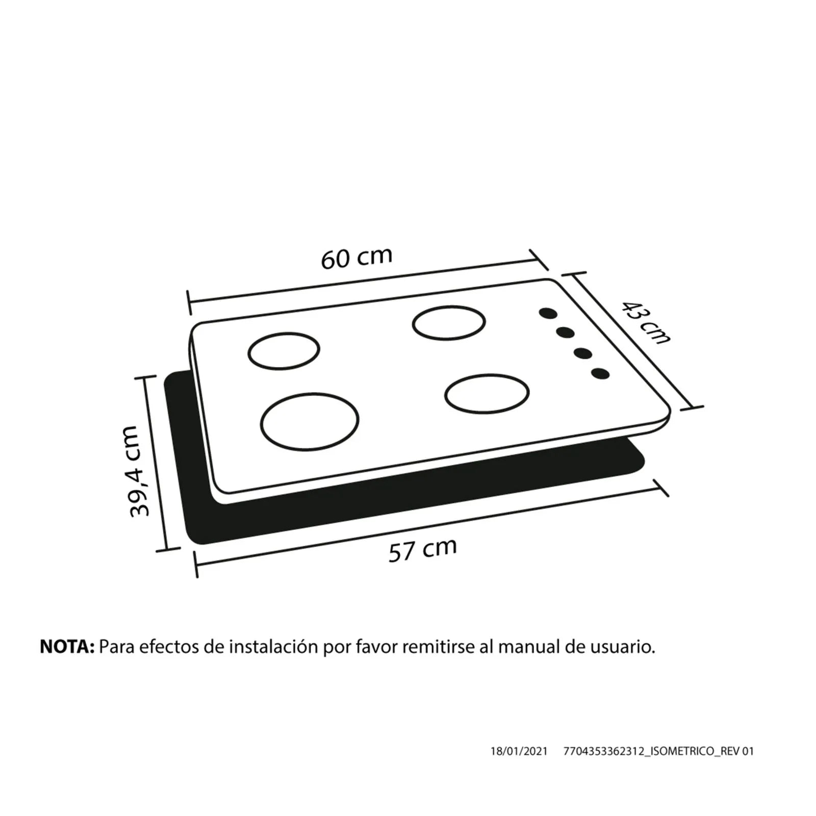 Estufa de empotrar a gas esmaltada color negro de 60X43 cm. Cuenta con 4 fogones en diferentes tamaños que se acomodan a los diámetros de tus ollas y pesos de tus preparaciones, parrillas en platina con 8 puntos de apoyo que brindan estabilidad y seguridad. Es de muy facil limpieza gracias a sus perrillas removibles. Enciende solo con girar las perillas