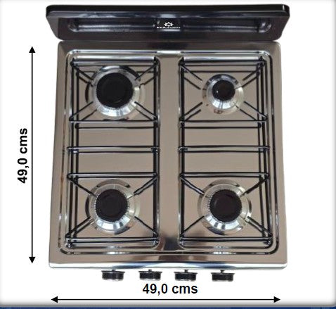 Cuenta con quemadores en aluminio con tapilla de hierro esmaltado, dos parrillas en alambrón y perillas de baquelita con acabado cromado que aportan un toque moderno.