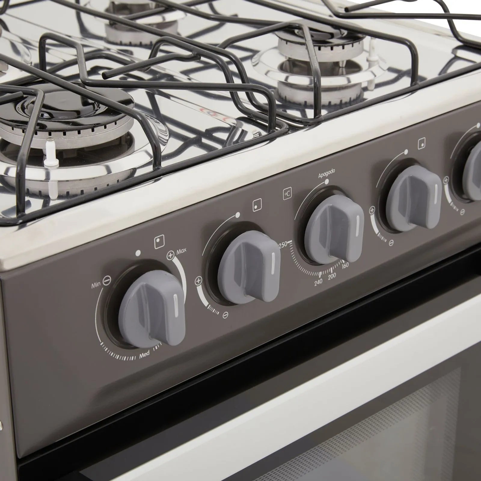 Estufa Haceb mixta con mesa de 50 cm en acero inoxidable para gran durabilidad, fácil limpieza y visor más amplio. Cuenta con 4 fuentes de calor, 1 eléctrica y 3 a gas. Sus parrillas antideslizantes brindan estabilidad, seguridad y alta eficiencia.