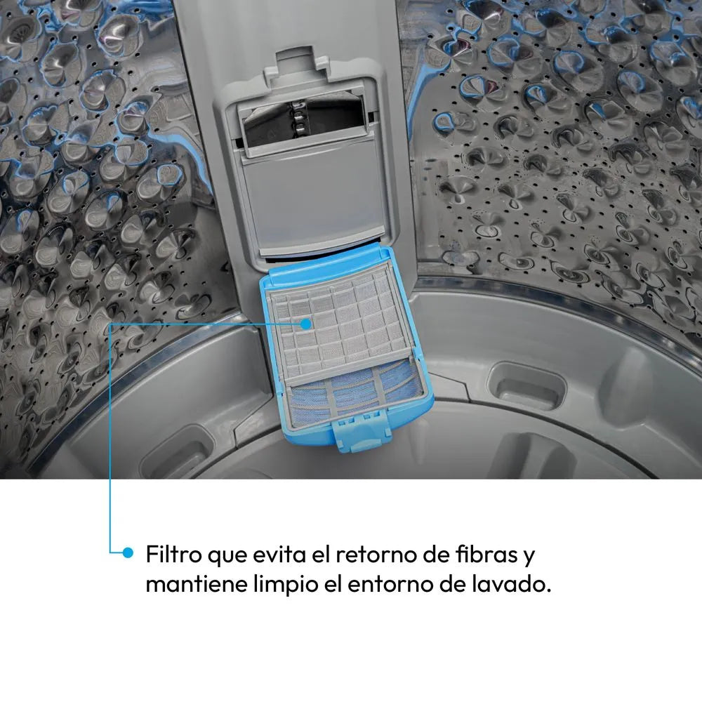 Lavadora automática de carga superior con capacidad de 1 8 Kg, puerta de seguridad en vidrio templado, sistema One Touch, 8 programas de lavado, tambor en acero inoxidable, asistente antienredos, función CARE + para cuidado de tu ropa y apagado automático. Ideal para un lavado eficiente, silencioso y con mayor cuidado de las prendas.